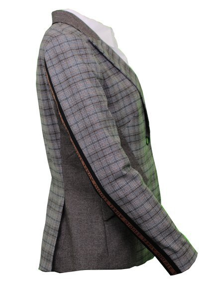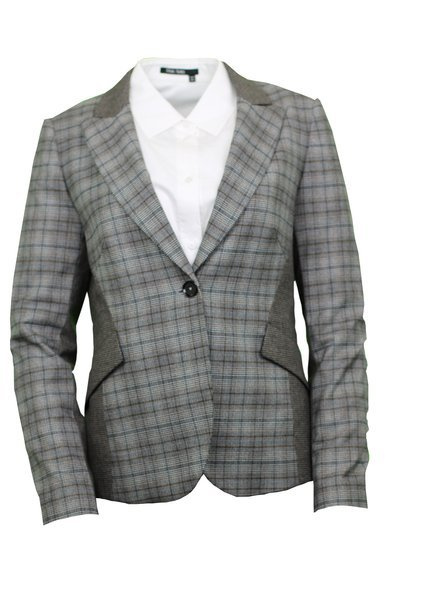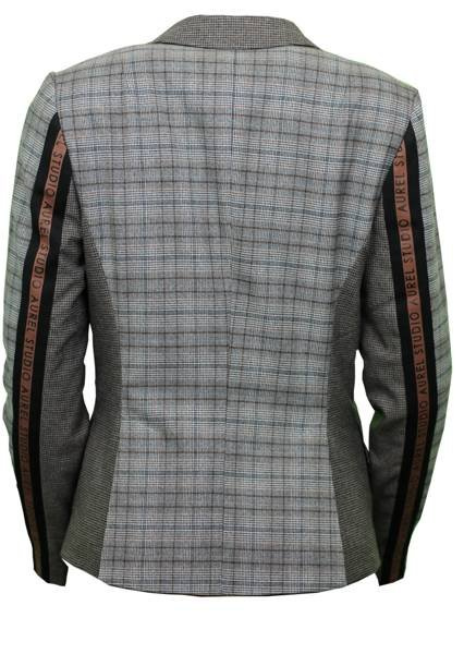 Marynarka damska MARC AUREL w kratkę – niezwykle elegancka marynarka łącząca w sobie dwa bardzo podobne aczkolwiek kontrastowe wzory. Całość dopełniona została ozdobną miedzianą tasiemką zdobiącą rękawy.