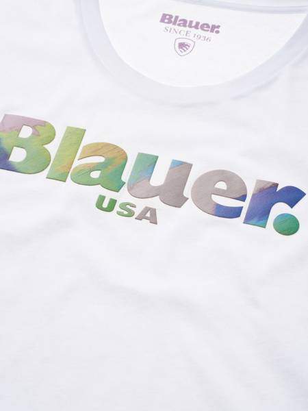 T-SHIRT DAMSKI BLAUER BLDH02243 - Wygodna i miękka koszulka damska z okrągłym dekoltem z bawełnianego dżerseju z krótkimi rękawami. Różnobarwny nadruk na środku koszulki z nazwą marki odznacza się wypukłością i trój-wymiarem.