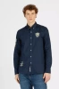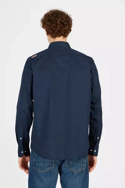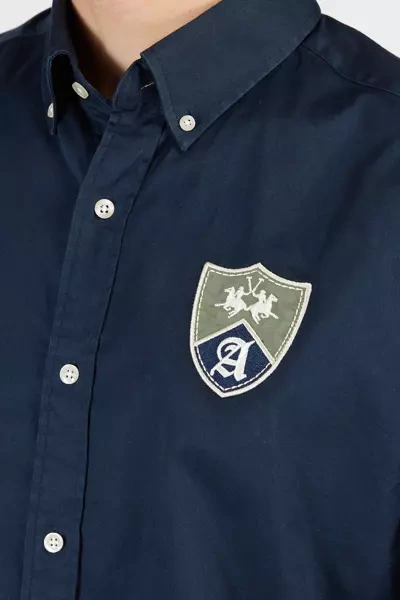 KOSZULA MĘSKA LA MARTINA - w granatowym kolorze. Fason typu regular fit. Z klasycznym kołnierzem oraz mankietami. Zapinana za pomocą guzików. Posiada ozdobne hafty, w tym jeden z logo marki.