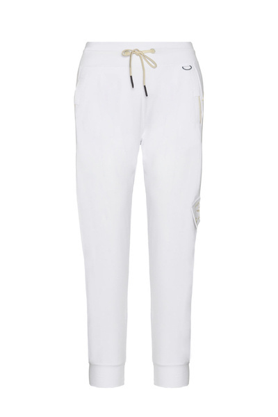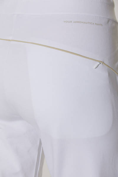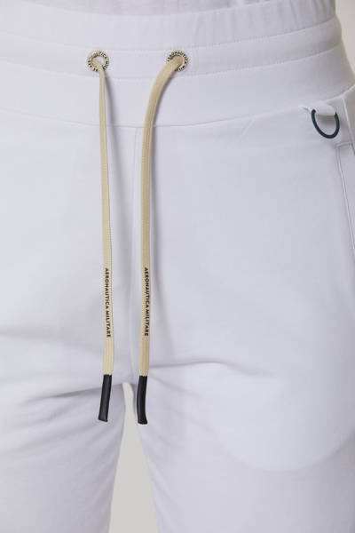 SPODNIE DAMSKIE AERONAUTICA MILITARE - białe joggery z gumowym logo na lewej nogawce. Jest to niezbędny element garderoby letniej. Uroku dodają im elementy w beżowym kolorze. Stworzą one idealną stylizację sportową wraz z bluzą do kompletu.