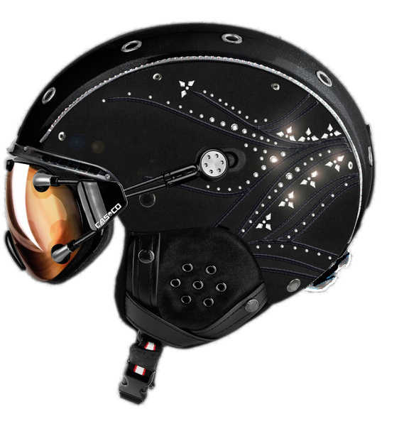 KASK NARCIARKI CASCO SP-3 MAJESTY BLACK CRYSTAL - kask z limitowanej edycji Majesty Edition. Jest to jeden ze 100 wyprodukowanych na cały świat kasków znanej marki CASCO. Unikalny haft na czarnym nubuku wykończony został prawdziwymi kryształkami Swarovskiego. Na bocznej części posiada swój numer produkcji. Górny panel pięknie odbija światło, dzięki brokatowym drobinkom. Wykonany został metodą Monocoque-Ultra (wzmocniony odlew stalowymi nitami). Zapinany jest poprzez klamrę pod szyją. Rozmiar można dostosować do siebie dzięki systemowi disk fit VARIO, który pozwala regulować kask zarówno w obwodzie jak i nachyleniu, tak aby gogle dopasować do policzków i nosa. 3 częściowa konstrukcja skorupy zapewnia optymalna amortyzację oraz najwyższą ochronę podczas jazdy. Liczne otwory i kanały pozwalają na odpowiednią wentylację (system Klima-Automatik). W kasku można zastosować gogle mocowane za pomocą systemu Magnet Link (FX-70), ponieważ ma wbudowane otwory mocujące. Wnętrze jest wymienne oraz nadaje się do prania.