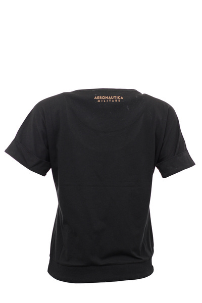 T-SHIRT DAMSKI AERONAUTICA MILITARE - koszulka damska włoskiej marki Aeronautica Militare. Ozdobiona została kultowym orzełkiem z wieżyczką, wykonanym z koralików. Oryginalności dodaje jej regulacja za pomocą sznurka na dole.