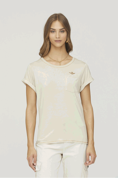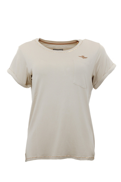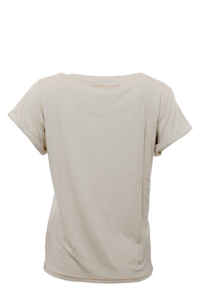 T-SHIRT DAMSKI AERONAUTICA MILITARE - ozdobiona została koralikami przy dekolcie oraz dole, które dodają jej oryginalności. Klasyczny kolor sprawi, że z łatwością dopasujesz ją do swoich stylizacji.