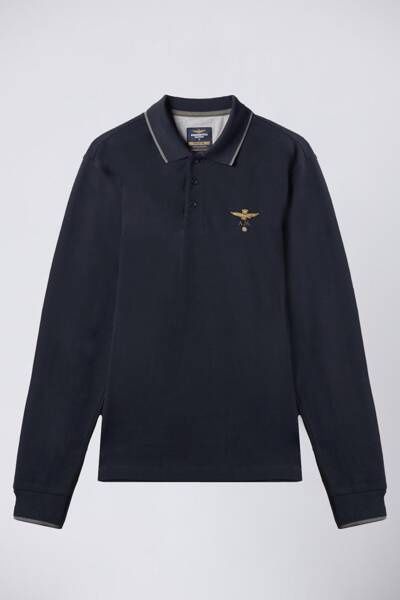 POLO MĘSKIE AERONAUTICA MILITARE - Granatowa męska koszulka polo z długim rękawem to elegancki i jednocześnie casualowy element garderoby, idealny na chłodniejsze dni. Łączy w sobie klasyczny krój koszulki polo z wygodą długiego rękawa, co czyni ją uniwersalnym wyborem zarówno na bardziej formalne, jak i codzienne okazje.
