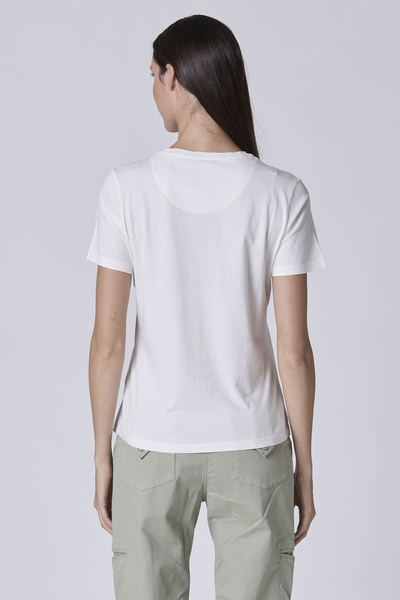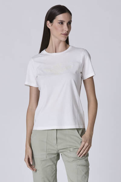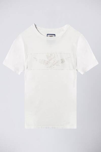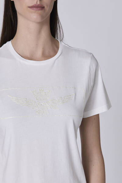 T-SHIRT DAMSKI AERONAUTICA MILITARE - Biały t-shirt o klasycznym, uniwersalnym kroju. Na przodzie koszulki znajduje się efektowne, brokatowe logo orła z wieżyczką, które dodaje całości wyjątkowego charakteru i subtelnego blasku. Dzięki swojemu minimalistycznemu, a jednocześnie eleganckiemu designowi, t-shirt idealnie sprawdzi się zarówno w casualowych, jak i bardziej stylowych zestawieniach.