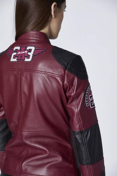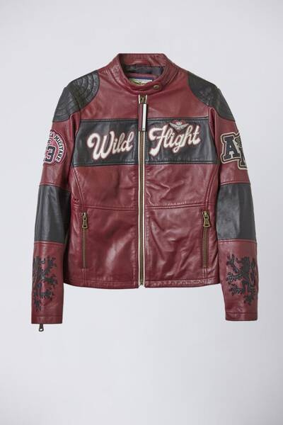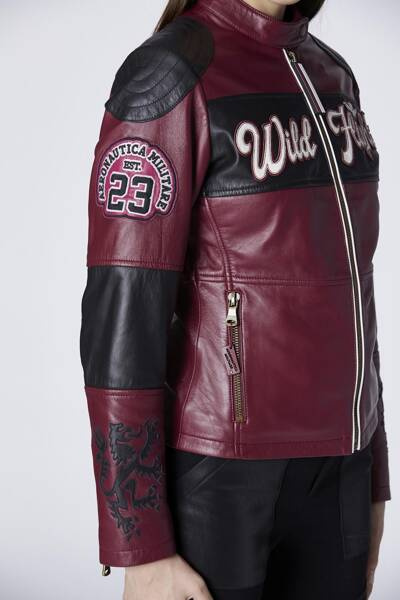 KURTKA SKÓRA DAMSKA AERONAUTICA MILITAREmodna kurtka skórzana w kolorystyce bordowo-czarnej, nada każdej stylizacji charakteru. Liczne naszywki ręcznie haftowane na przodzie oraz rękawach oddają  hołd światu lotnictwa.